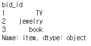 "item": ["TV", "jewelry", "book"]}).set_index("bid_id")