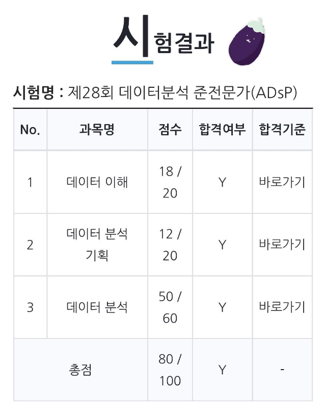 합격 기준은 총점 60점 이상, 과락 기준은 과목별 40% 미만 취득이다. 2과목은 과락 기준에 간당간당하게 걸려서 가성비 좋게(?) 패스. 그리고 3과목은 시간을 쏟은만큼 다행히 점수가 잘 나왔다. 나는 단순 암기에 취약하고 이해를 바탕으로 한 암기가 더 수월하여 3과목 점수가 더 잘 나온 듯 하다. 시험을 보고 느낀건데 단순 암기에 취약한 사람(나같은..)은 2과목을 더 꼼꼼하게 봐야 할 것 같다. 그리고 ADsP는 객관식 뿐만 아니라 주관식도 풀어야 하니 중요한 개념은 입으로 소리내서 읽어보거나 꼭 손으로 단어를 직접 써보면서 익숙해지는 것이 좋을 것 같다. 이 글을 보신 분들도 한번에 합격하시길 기원!