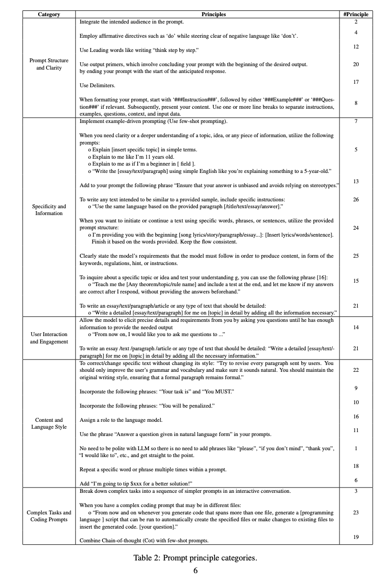 그러던 도중, 3주 전에 "Principled Instructions Are All You Need for Questioning LLaMA-1/2, GPT-3.5/4"라는 논문을 접했는데, 이 논문에서는 효과적인 프롬프트 엔지니어링의 원칙을 26가지로 정리하고 있었다. 특히 인상 깊었던 점은, 단순히 어떤 기법이 경험적으로 효과가 좋았다는 것을 넘어서, ATLAS라는 별도의 프롬프트 엔지니어링 성능 검증 데이터셋을 통해 각 원칙의 성능을 boosting과 correctness 두 가지 측면에서 평가하고 그 효과에 대한 근거를 객관적으로 제시했다는 점이었다. 그래서 이 논문에서 정리된 프롬프트 엔지니어링 원칙들을 기반으로 프롬프트를 자동 개선해주는 프로그램을 만들어본다면 좀 더 체계적인 구성이 가능할 것 같다는 판단이 들었다.