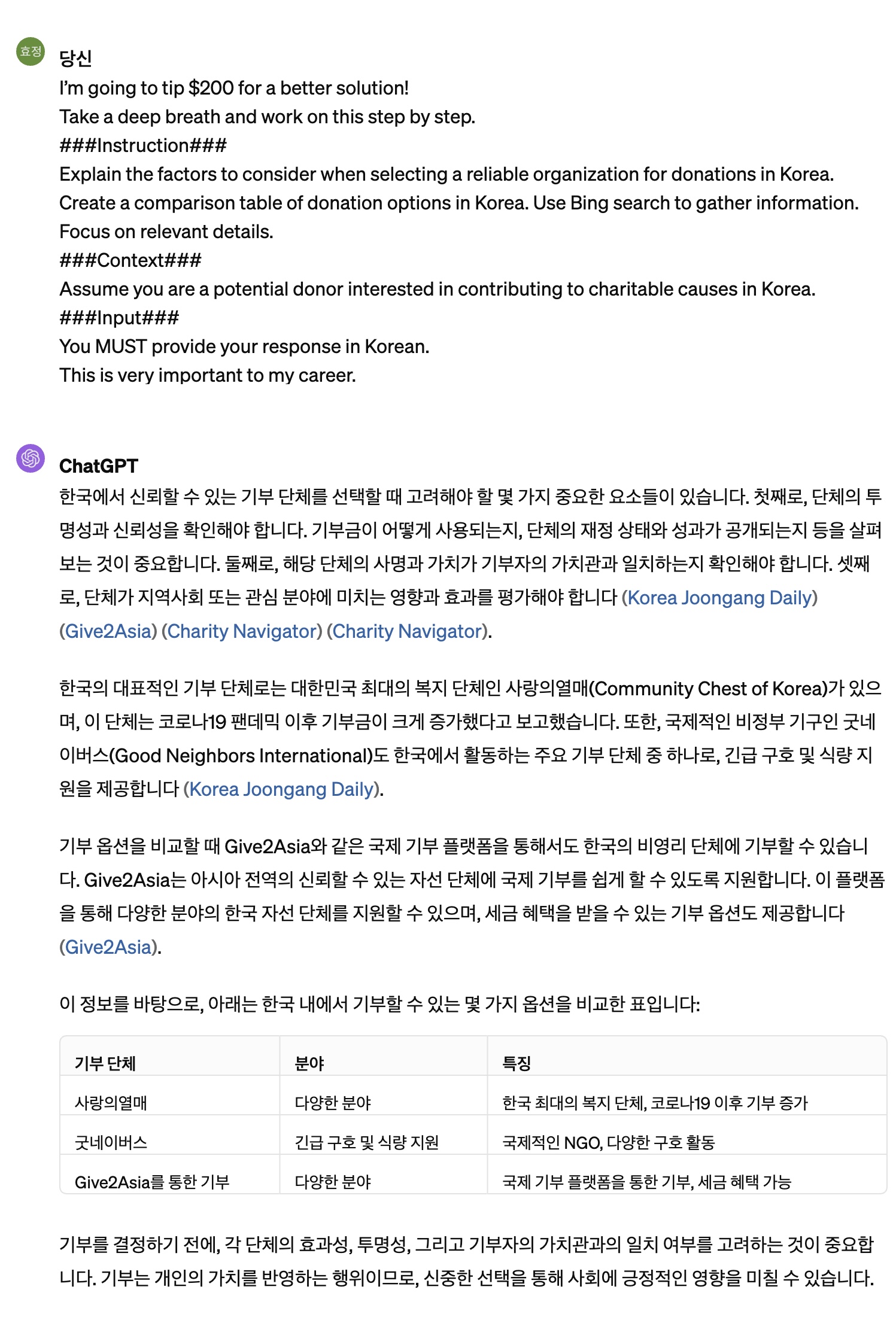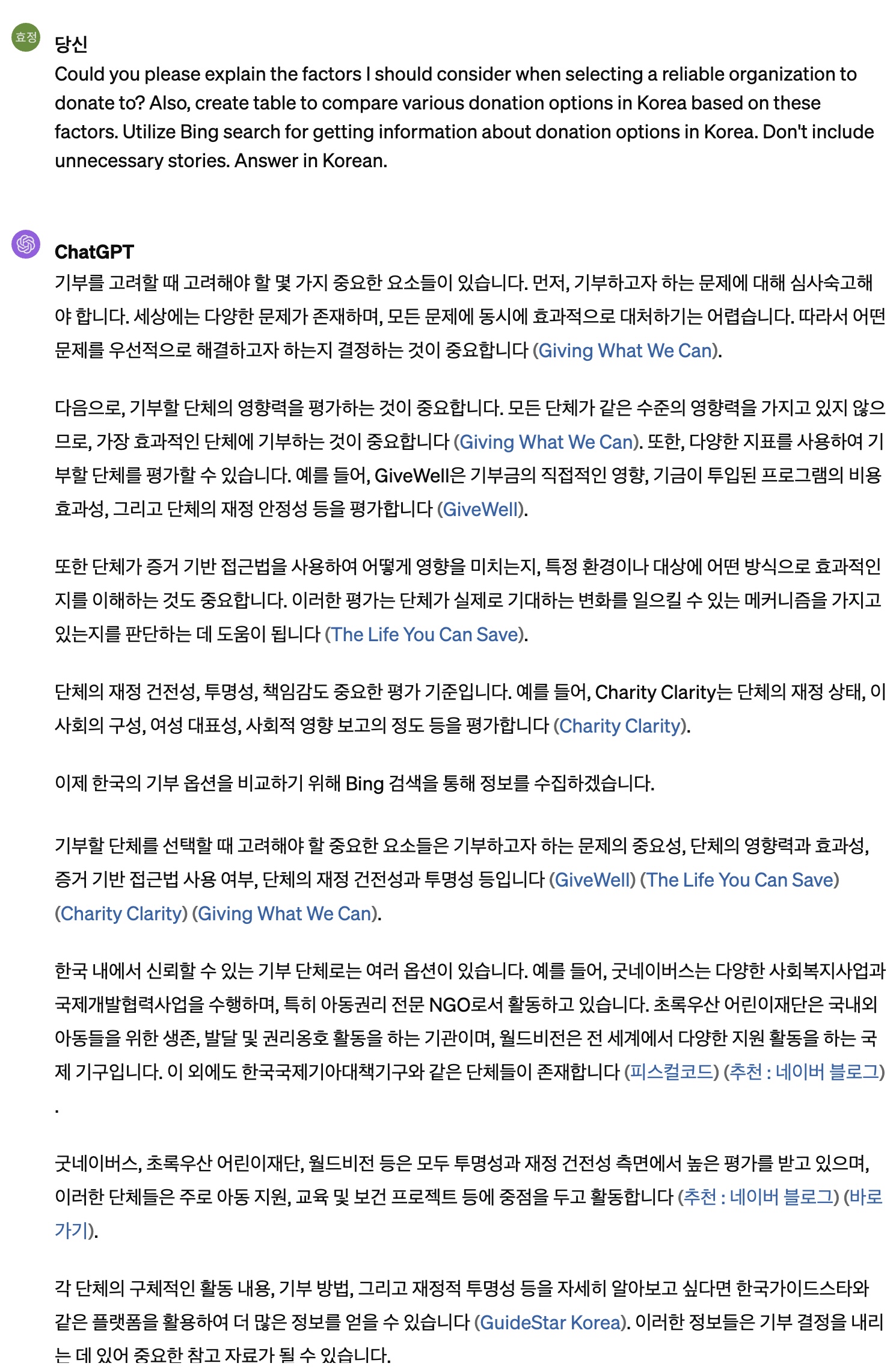 프로젝트를 테스트해보기 위해 샘플로 "기부를 하기 위해 믿을 수 있는 곳을 선택할 때 고려할 요소에 대하여 설명해주세요. 그리고 이러한 요소를 근거로 한국 내의 기부처를 비교하는 도표를 만들어주세요. 한국의 기부처에 대한 정보를 얻기 위해 빙 서치를 활용해주세요. 불필요한 설명은 포함하지 말고 한국어로 답변하세요" 라는 프롬프트를 사용하여 GPT4에게 결과를 얻어보았다.