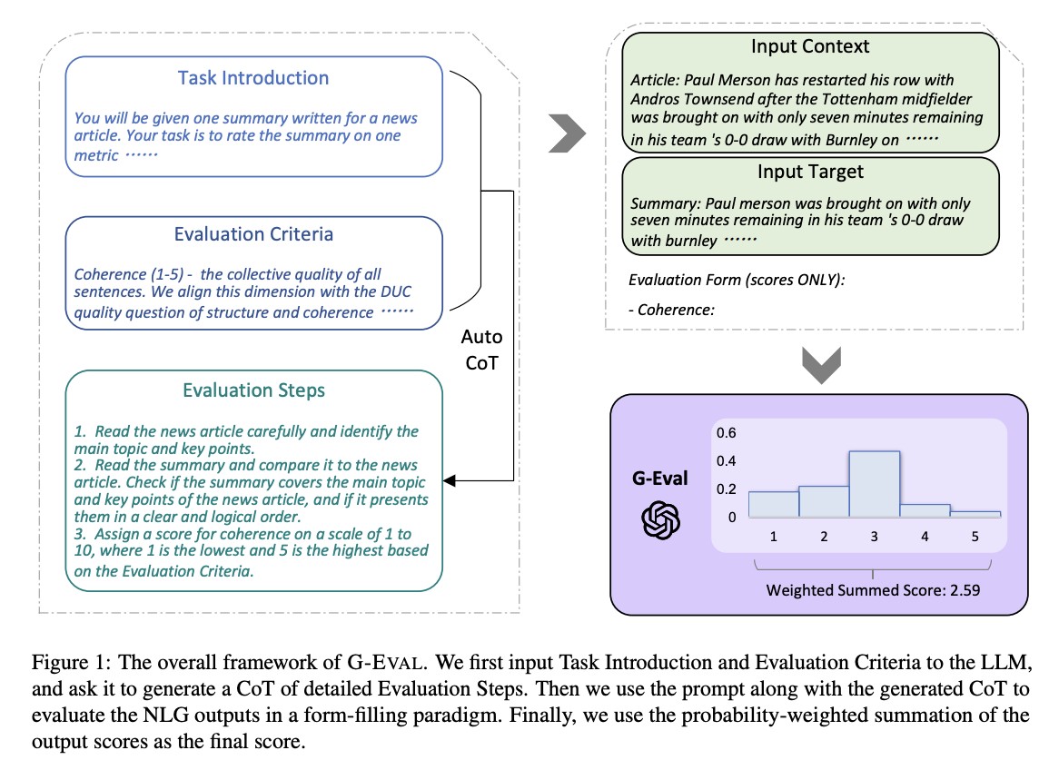 LLM의 Chain-Of-Thought (CoT)와 form-filling(양식 채우기) 기법을 활용하여 사용자가 정의한 기준에 따라 LLM의 생성 결과물의 품질을 평가하는 프레임워크이다. 이 방법은 프롬프팅 기법이 중요하게 작용하기 때문에, CoT를 통해 사용자 기준에 대한 가이드 및 evaluation steps 등의 컨텍스트를 더 정교하게 제공할수록 평가 품질을 향상시킬 수 있다.