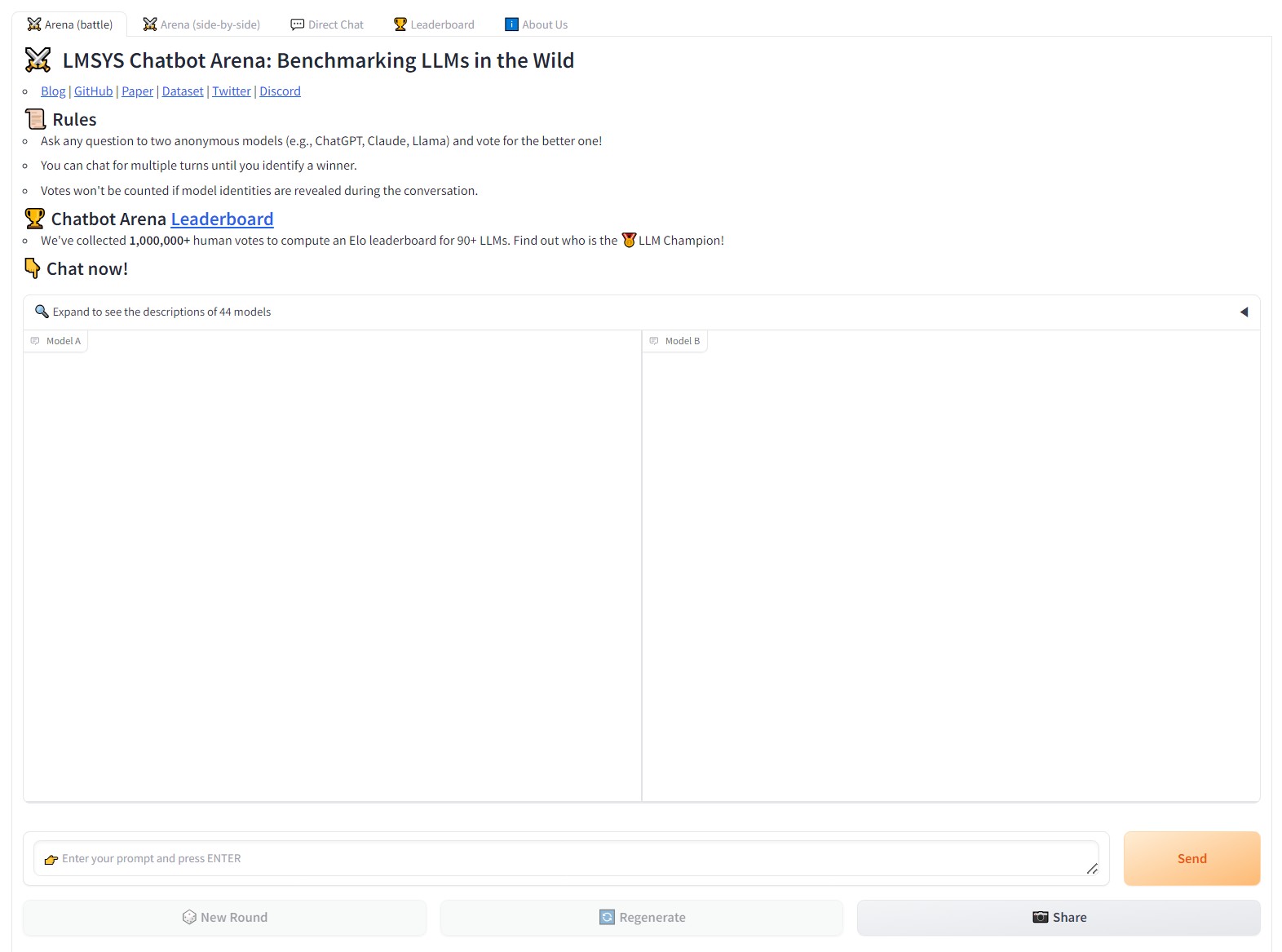 1. Chatbot Arena https://chat.lmsys.org/